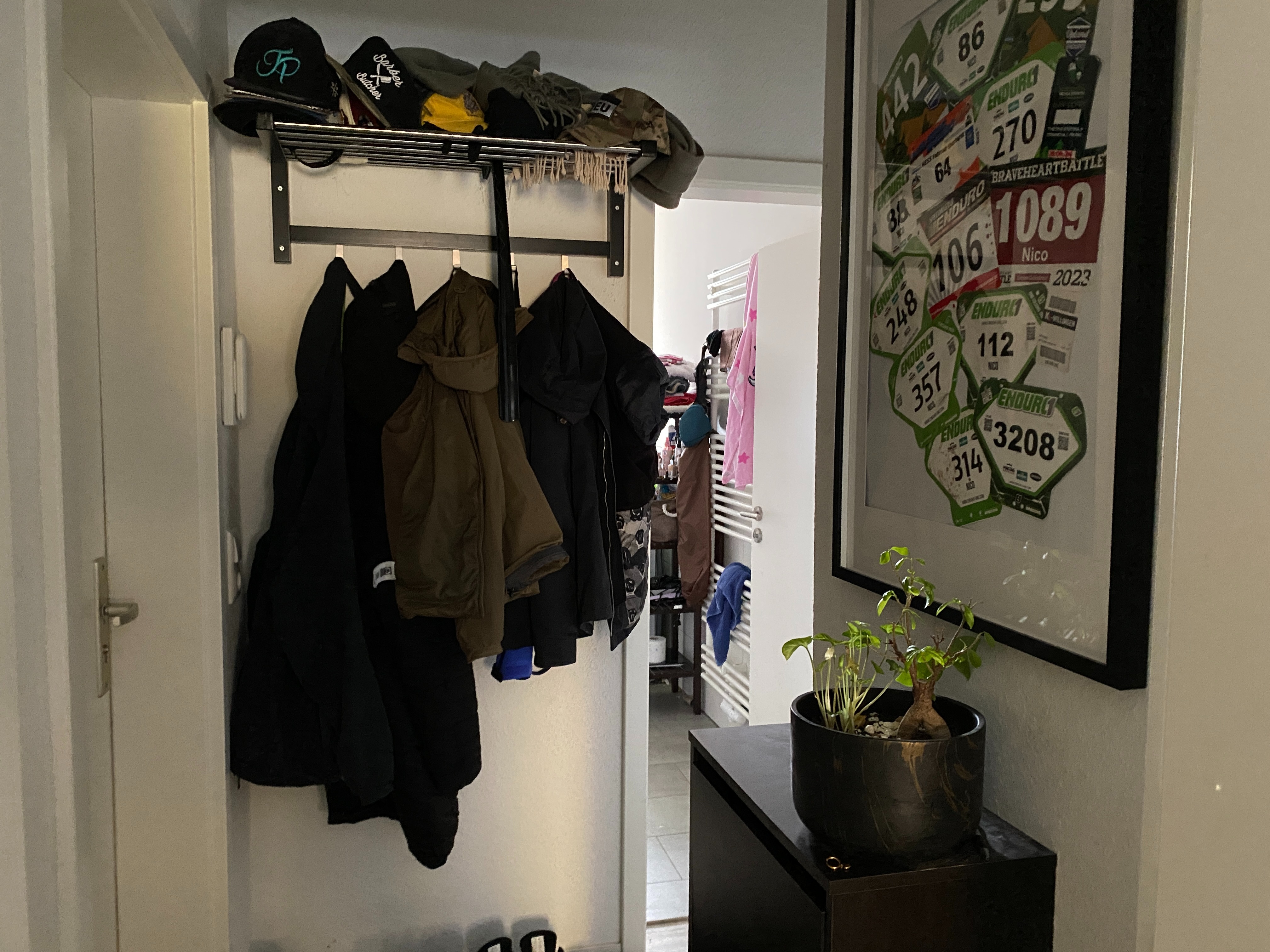 Über den kleinen Wohnungsflur erreichen Sie das Badezimmer (ca. 4,7 m², Dusche (Glas) und 1 Fenster, Handtuchheizkörper, große Fliesen).