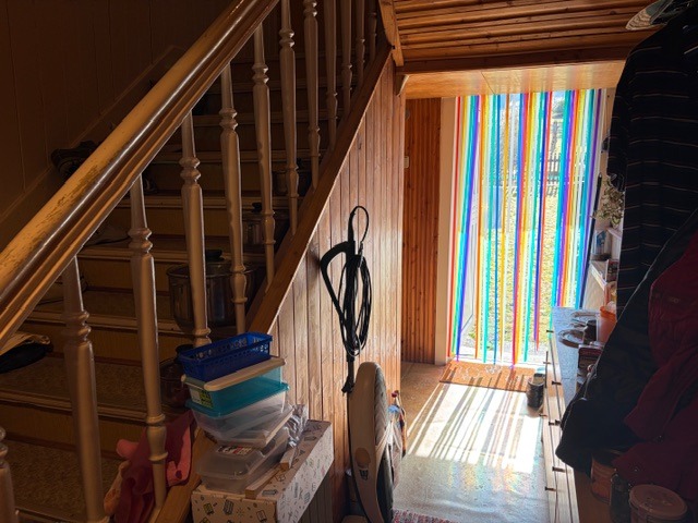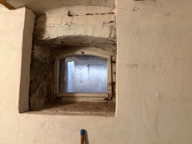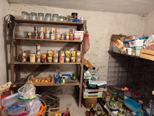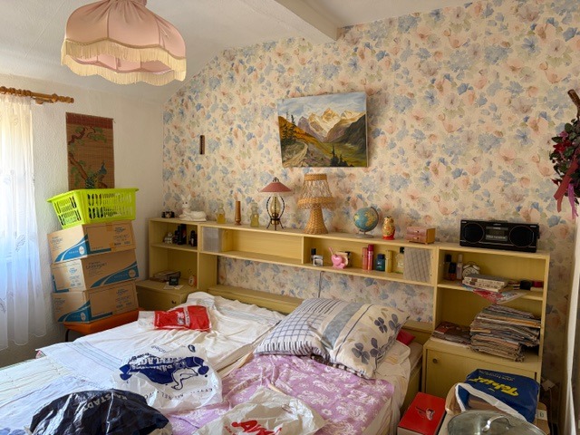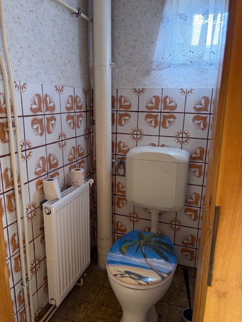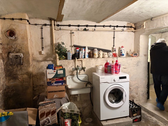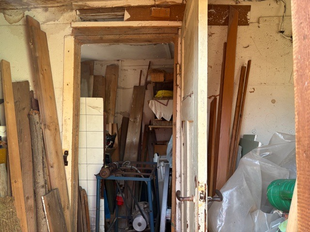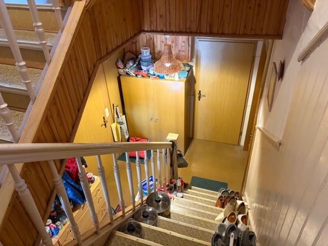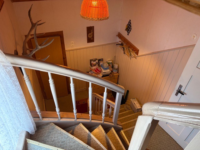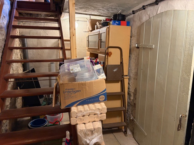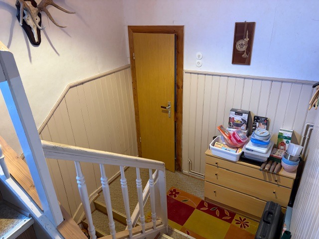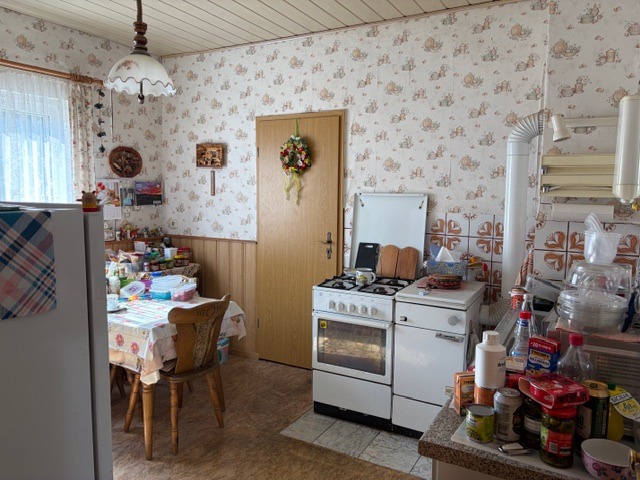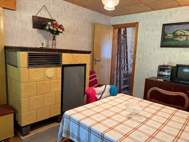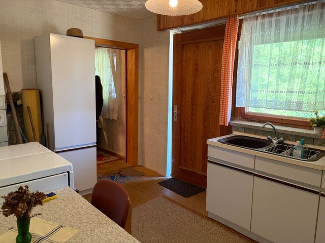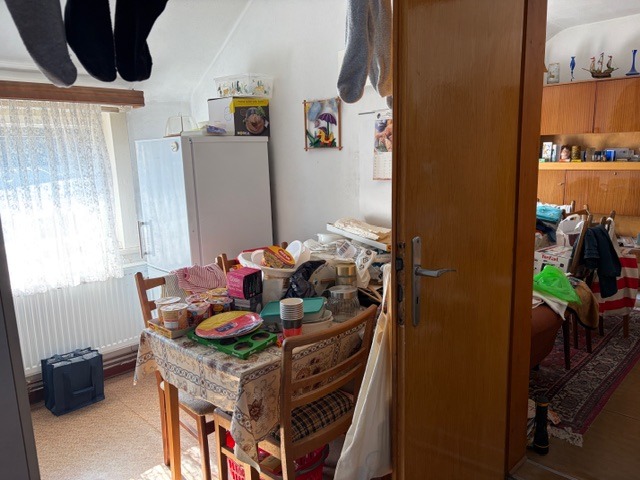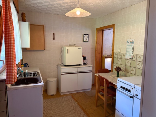 "Unsere" linke Seite des Doppelhauses wird vom separat angebauten Eingangsbereich/Treppenhaus begangen, der Vorabu beinhaltet die Zugangstreppe und einen Abstellraum (ca. 4 m²) im hinteren Teil. Von hier gelang man in den Hausflur. Vom hier geht es in den Hof, in das WC, das Bad (Baujahr ca. 2016, Badewanne, Dusche, Fenster (Finestra Baujahr ca. 2016, Rolladen, Elektroheizung, (nicht im Heizkreis enthalten) ca. 5 m², gefliest) und in die Küche (Fenster, Finestra Baujahr ca. 2016, Rollladen, ca. 12,5 m², PVC-Belag, Beistellherd). Von der Küche aus gelangt man ins Schlafzimmer (Doppelfenster der Fa. Finestra Baujahr ca. 2016, Rolladen, ca. 10 m², PVC-Belag) und ins Wohnzimmer (ein vier-flügliges Fenster, Kachelofen, textile Auslegware, ca. 22 m²).
