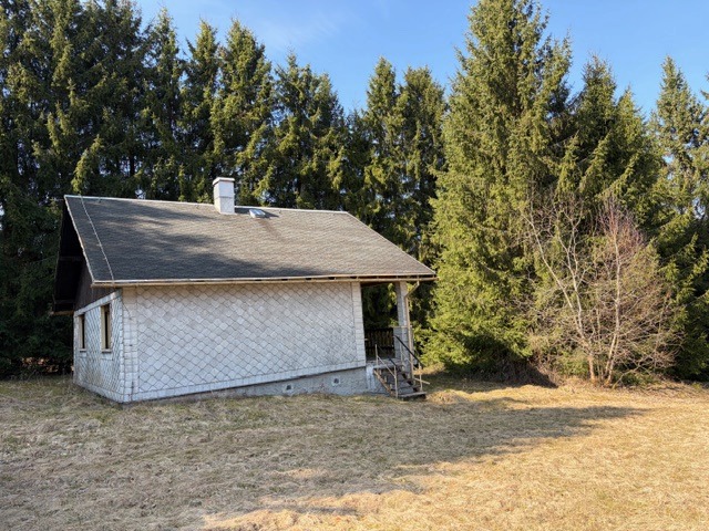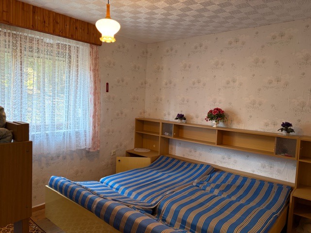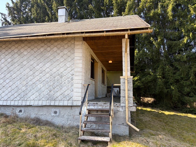 Der Bungalow kann von "hinten" angefahren werden, wird vom Haus Haus aus mit Strom und Wasser beliefert. Für das Abwasser gibt es eine Sickergrube mit ca. 3 m³ Fassungsvermögen. Er unterteilt sich in Terrasse (überdacht, ca. 12 m², Küche (Fenster, PVC-Belag, ca. 9,5 m²), Schafen (Fenster, PVC-Belag, ca. 11 m²), Wohnen (Fenster, Kachelofen, PVC-Belag, ca. 16 m²), und das Bad (gefliest, Fenster, Dusche, WC, Waschbecken, ca. 4 m²). Das Satteldach ist mit Schindeln belegt, Dämmung der Decke mit Glaswolle, Aussendämmung ist nicht vorhaneden (Wandaufbau: Hohlblocksteine, Holzverlattung und die Asbestschieferung von innen an den Hohlkblocksteinen wurden Sauerkkrautplatten verarbeitet und dann verputzt. Der Bungalow ist mit einem Blitzableiter und zusätzlich mit Erdspieß abgesichert.