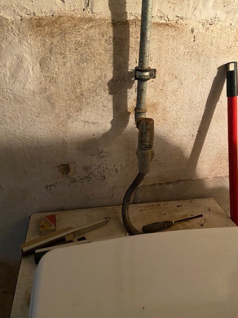 Die einstige Klärgrube (ca. 3-5 m³) dient als Wasserspeicher – der Überlauf ist an den Abwasserkanal angeschlossen.