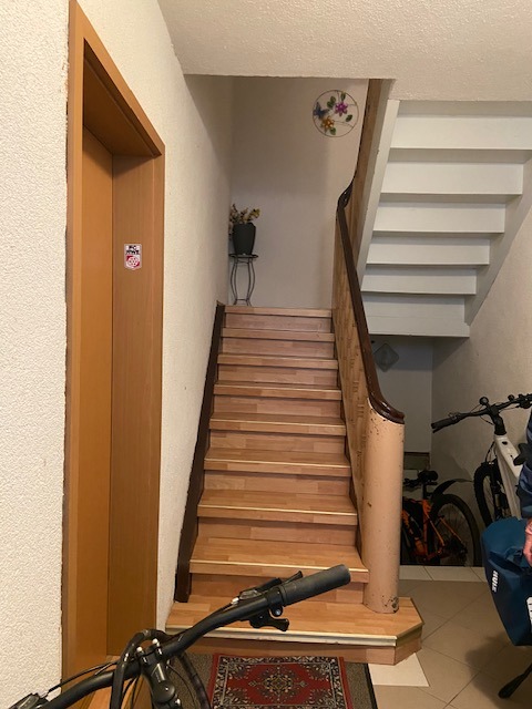 Treppen innen: geflieste Treppe zum Innenhof, Geschosstreppe als Holztreppe mit Laminat und