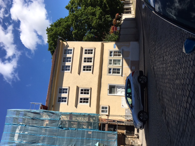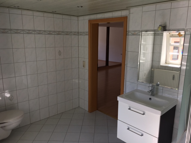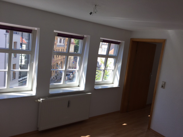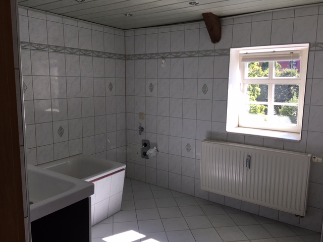 Das Schlafzimmer hat drei Fenster, ist zur Zimmerstraße ausgerichtet. Das geräumige Bad ist gefliest, verfügt über eine Badewanne mit Glas-Duschaufsatz und ein Fenster, neben dem Fenster hat die Waschmaschine ihren Platz.