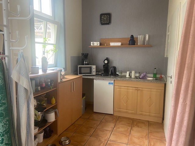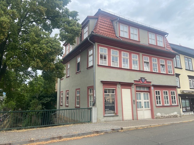 Kleine, ebenerdige,, barrierefreie, schnucklige Büroeinheit am Rand des Stadtzentrums Arnstadt – ideal für ruhiges Gewerbe (Dienstleister, Atelier, Einzelhandel, Büro, Handwerk) eventuell mit Laufkundschaft. Die Gewerbeeinheit unterteilt sich in 2 Räume – einer liegt "über den Flur" separat, da kann man sehr gut ungestört arbeiten, wenn im anderen Gewerberaum die Kunden "Schlange stehen" und mit köstlichem Kaffee aus der angrenzenden Küche bedient werden. (Ggf. kann die kleine Pentriküche vom Vormieter übernommen werden.) Ein WC-Bereich (ca. 2 m²) begehbar vom Küchenbereich, der im hinteren Teil des Besucher-Gewerberaumes angrenzt, ist gefliest und ebenfalls liebevoll gestaltet.